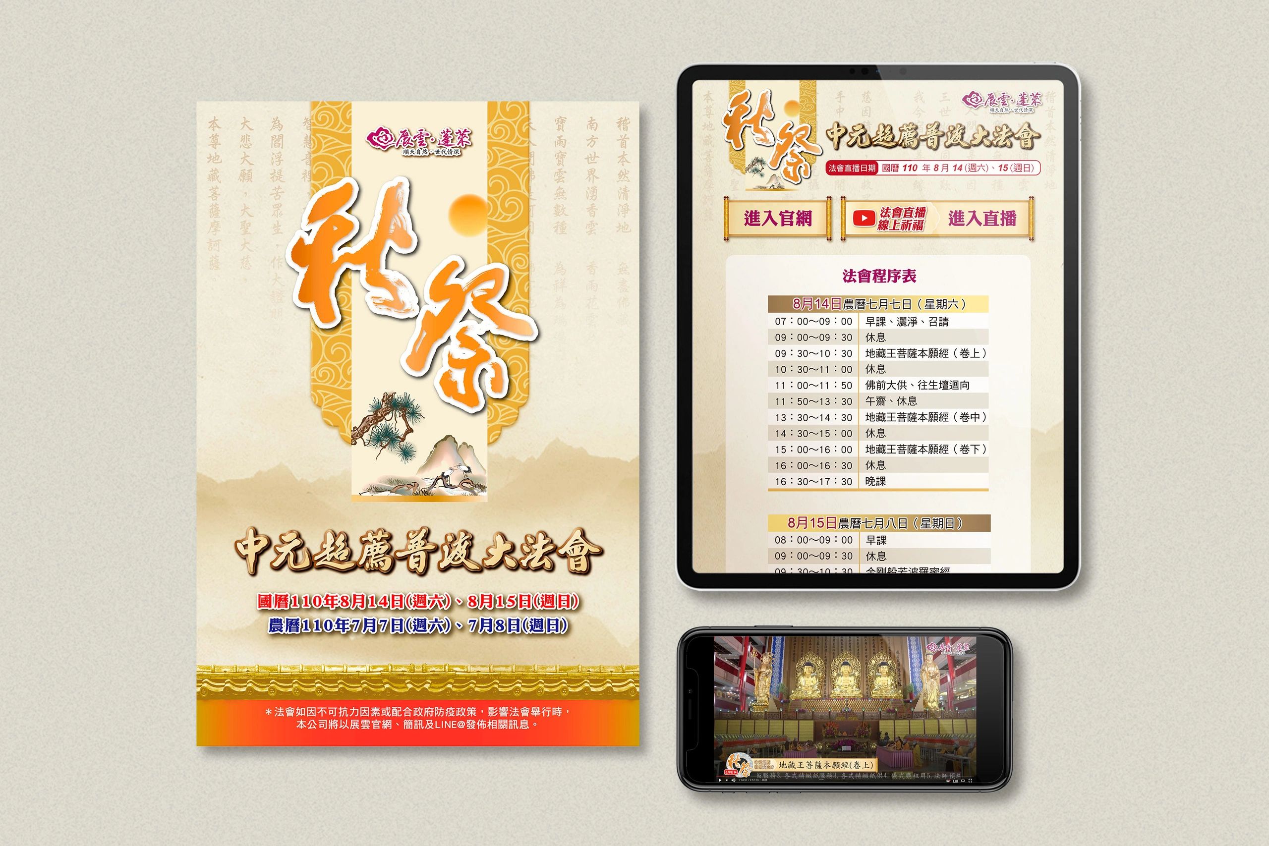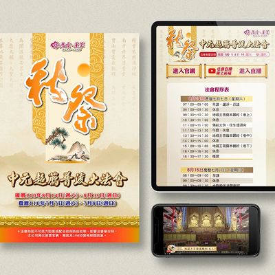 網頁與線上直播的標題設計延續通知函的主視覺風格,並巧妙融入捲軸元素,象徵法會的開啟與誠摯邀請,使整體設計更具一致性與儀式感。