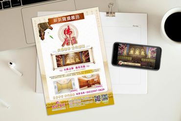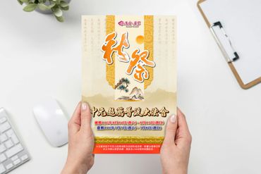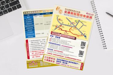 通知函的視覺設計營造出莊嚴而吉祥的氛圍,並融入山水畫元素,象徵平靜與超脫,充分展現佛教與道教儀式的色彩美學與精神內涵。摺頁設計則結構清晰,每個頁面皆詳盡介紹法會相關資訊及提供服務內容,方便閱覽與理解。