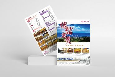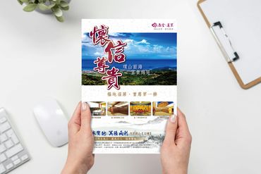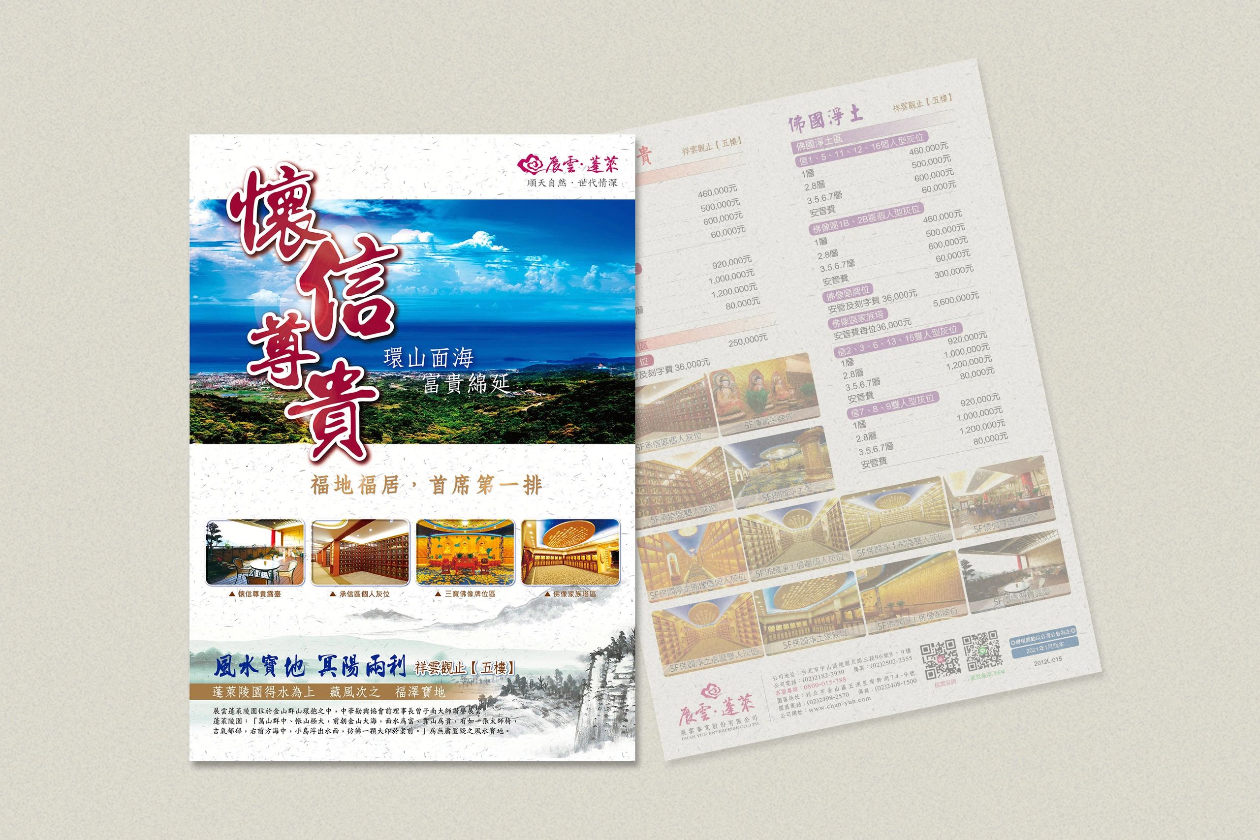 正面以園區壯闊山水景致襯托商品名稱「懷信尊貴」,營造大器非凡的氛圍,並巧妙引導視線至標語與環境照片,突顯商品優勢。山水畫元素融合現代設計,使整體視覺更顯豐富且吸睛,展現雅致質感。