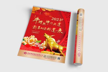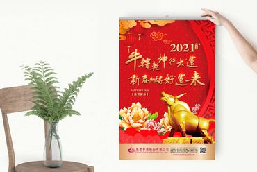 2021年為辛丑牛年,金牛象徵堅韌不拔、奮發向上的精神,寓意企業與客戶在新的一年持續成長、穩健發展。標語「牛轉乾坤行大運,新春邁向好運來」以金色搭配動感排版,不僅增強視覺吸引力,更強調新年轉運與繁榮的寓意。綻放的牡丹花象徵富貴吉祥,增添節慶氛圍。